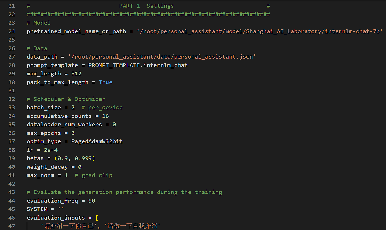 修改拷贝后的文件internlm_chat_7b_qlora_oasst1_e3_copy.py,修改下述位置: