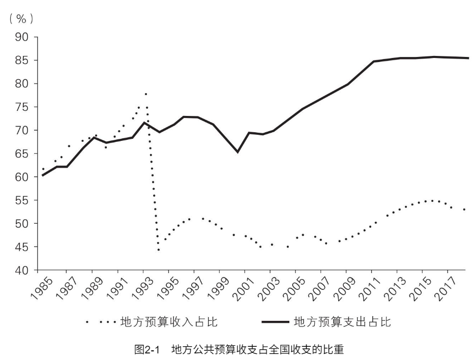 上一章介绍了政府的事权划分。而事权必然要求相应的财力支持,否则事情就办不好。所以从花钱的角度看,“事权与财力匹配”或者说“事权与支出责任匹配”这个原则,争议不大。但从预算收入的角度看,地方政府是否也应该有与事权相适应的收钱的权力,让“事权与财权匹配”,这个问题争议就大了。暂先不管这些争议,实际情况是地方政府的支出和收入高度不匹配。从图2-1可以看出,自1994年实行分税制以来,地方财政预算支出就一直高于预算收入。近些年地方预算支出占全国预算支出的比重为85%,但收入的占比只有50%—55%,入不敷出的部分要通过中央转移支付来填补。