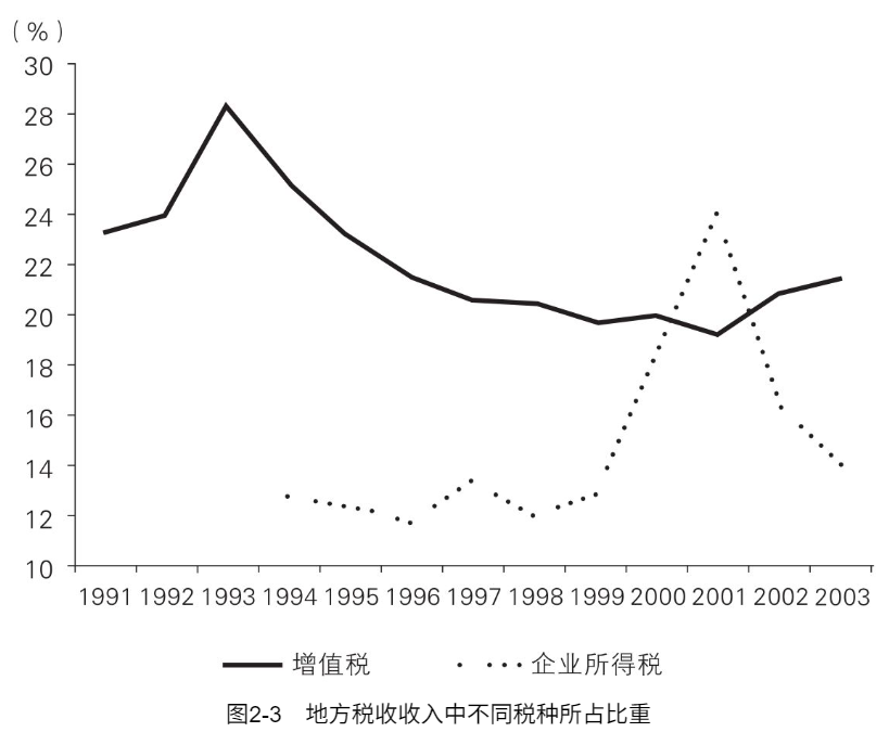 分税制改革中最重要的税种是增值税,占全国税收收入的1/4。改革之前,增值税(即产品税)是最大的地方税,改革后变成共享税,中央拿走75%,留给地方25%。假如改革前的1993年,地方增值税收入为100亿元,1994年改革后增长为110亿元,那么按照新税制,地方拿25%,收入一下就从1993年的100亿元下降到了27.5亿元。为防止地方收入急剧下跌,中央设立了“税收返还”机制:保证改革后地方增值税收入与改革前一样,新增部分才和中央分。1994年,地方可以拿到102.5亿元,而不是27.5亿元。因此改革后增值税占地方税收收入的比重没有急速下跌,而是缓慢地逐年下跌(图2-3)。