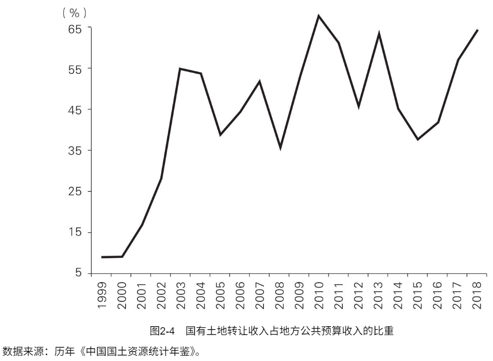 2001年,为治理土地开发中的腐败和混乱,国务院提出“大力推行招标拍卖”。2002年,国土部明确四类经营用地(商业、旅游、娱乐、房地产)采用“招拍挂”制度。于是各地政府开始大量征收农民土地然后有偿转让,土地财政开始膨胀。土地出让收入从2001年开始激增,2003年就已经达到了地方公共预算收入的55%(图2-4)。2008年全球金融危机之后,在财政和信贷政策的共同刺激之下,土地转让收入再上一个台阶,2010年达到地方公共预算收入的68%。最近两年这一比重虽有所下降,但土地转让收入的绝对数额还在上涨,2018年达到62 910亿元,比2010年高2.3倍。