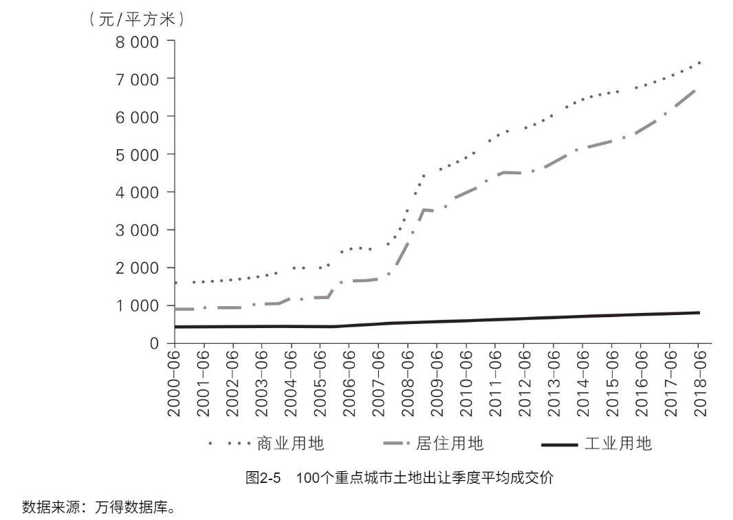 从时间点上看,大规模的土地财政收入始于21世纪初。2001年所得税改革后,中央财政进一步集权,拿走了企业所得税的六成。从那以后,地方政府发展经济的方式就从之前的“工业化”变成了“工业化与城市化”两手抓:一方面继续低价供应大量工业用地,招商引资;另一方面限制商住用地供给,从不断攀升的地价中赚取土地垄断收益。这些年出让的城市土地中,工业用地面积约占一半,但出让价格极低:2000年每平方米是444元,2018年是820元,只涨了85%。而商业用地价格增长了4.6倍,住宅用地价格更是猛增了7.4倍(图2-5)。