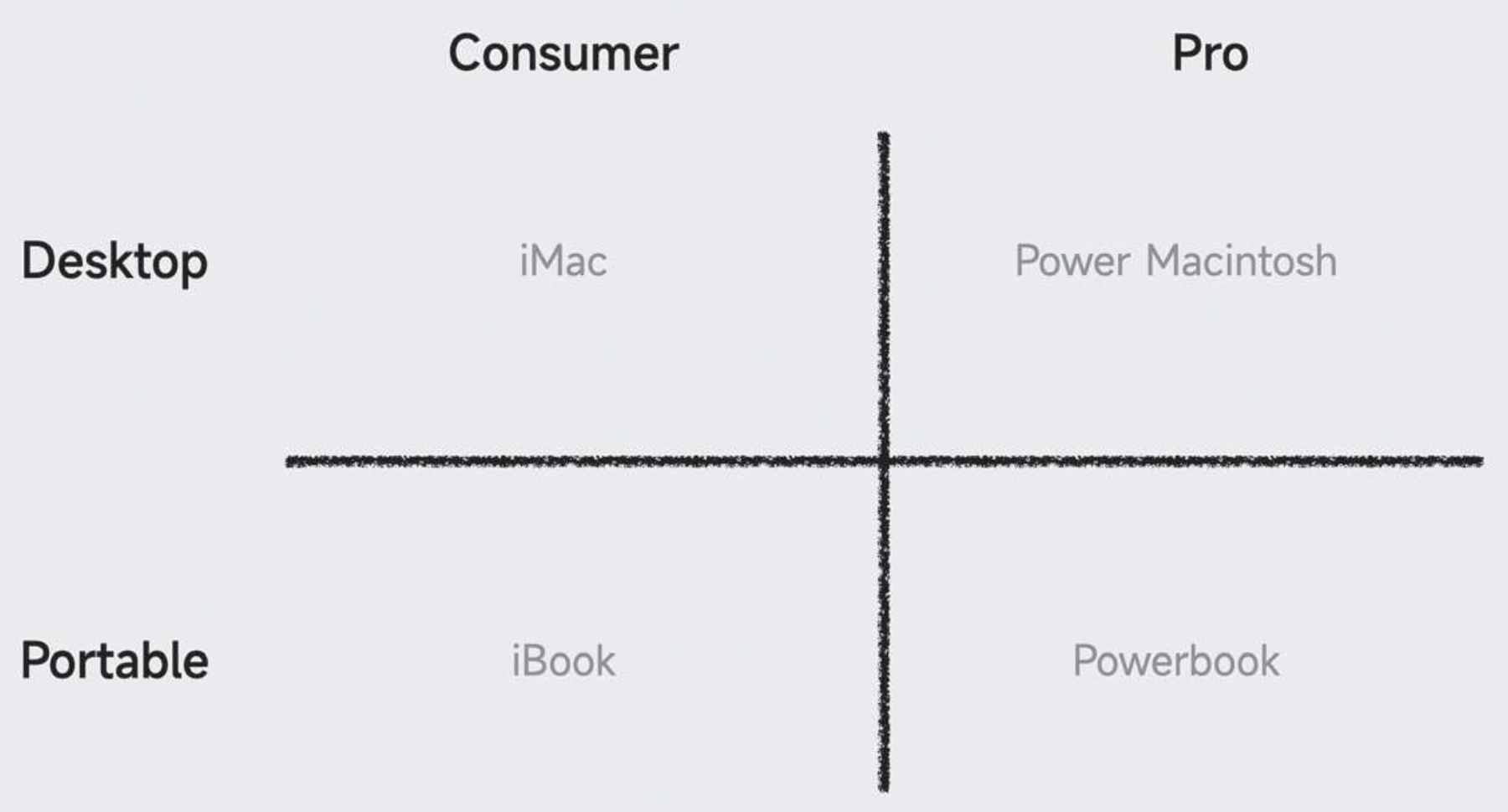 几周过后,乔布斯还是无法忍受那么多的产品,在一次产品战略会上发飙了。他在白板上画了一条横线和一条竖线,画了一个方形四格图,在两列顶端写上“消费级”“专业级”,在两行标题写上“台式”和“便携”,然后说:“我们的工作就是做四个伟大的产品,每格一个。”说服董事会后,苹果高度集中研发了iMac G3、Powerbook G3、Power Macintosh、iBook四款产品。